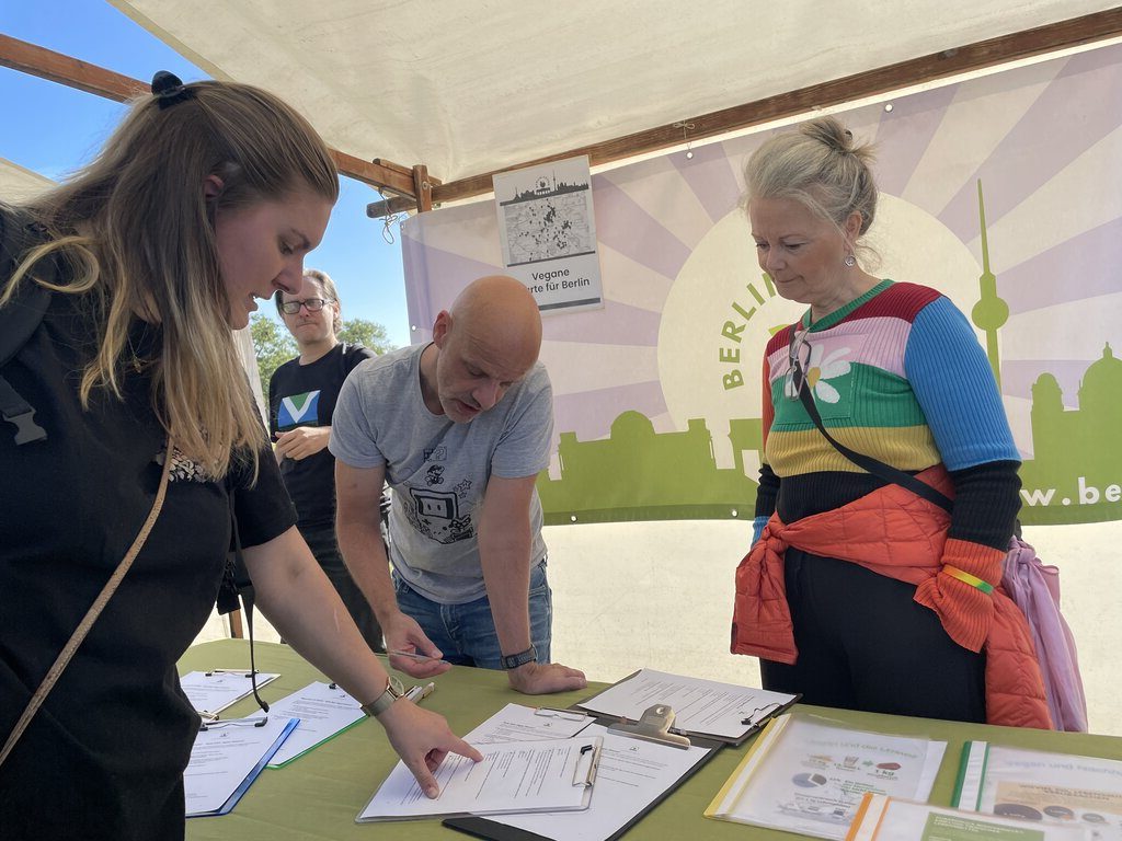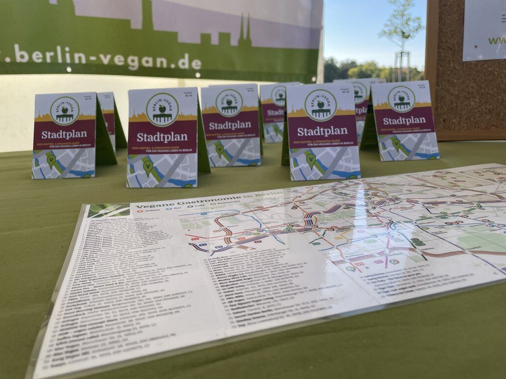 An unserem Infostand drehte sich – wie immer – alles um die Frage, was Veganismus mit Klima-, Umwelt- und Tierschutz zu tun hat. Wir hatten wieder unser Infomaterial zu veganen Angeboten in Berlin dabei, Tipps für den Einstieg in eine pflanzliche Ernährung sowie Hinweise auf unsere Online-Ressourcen und den Berlin-Vegan-Stadtplan.