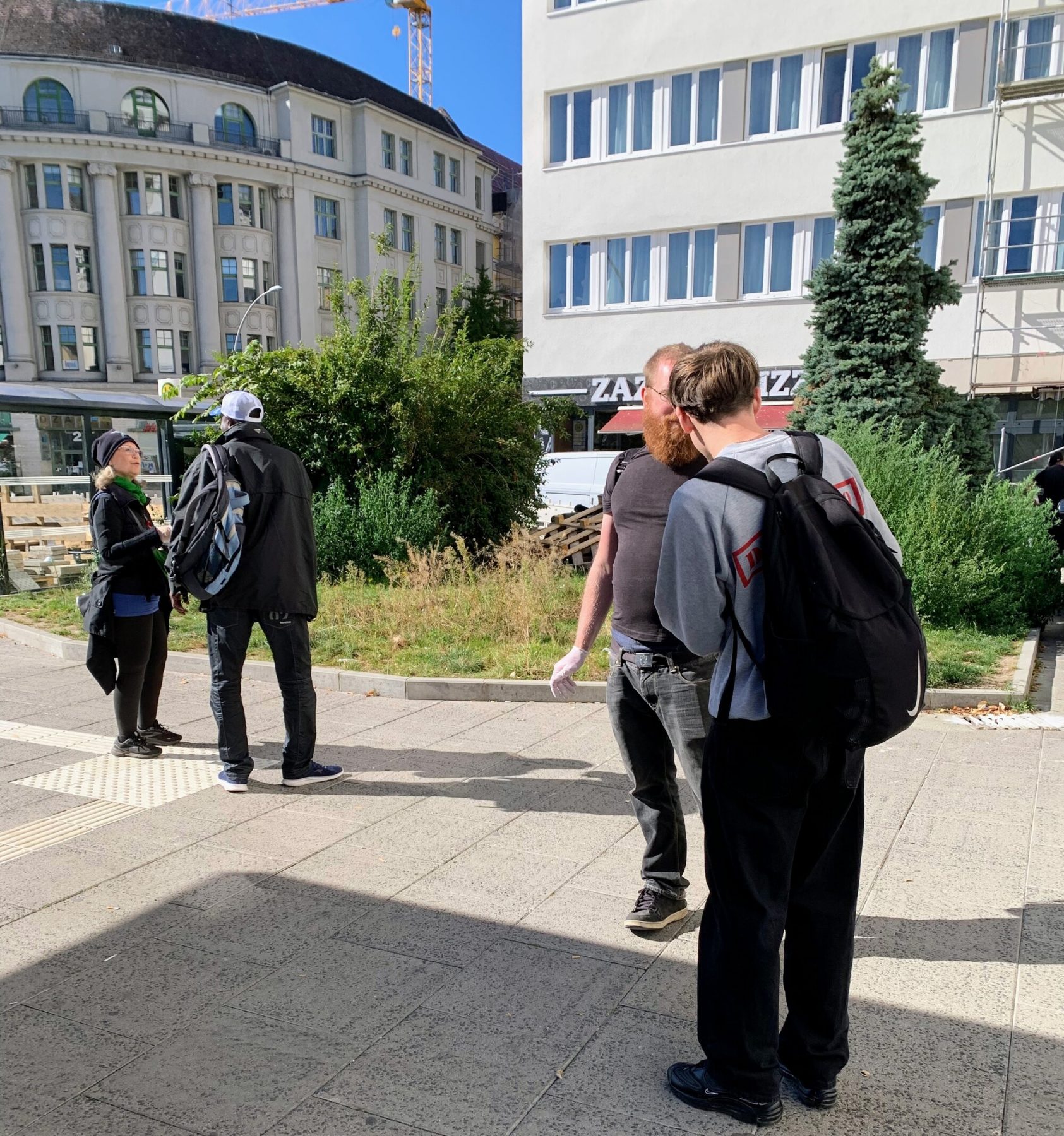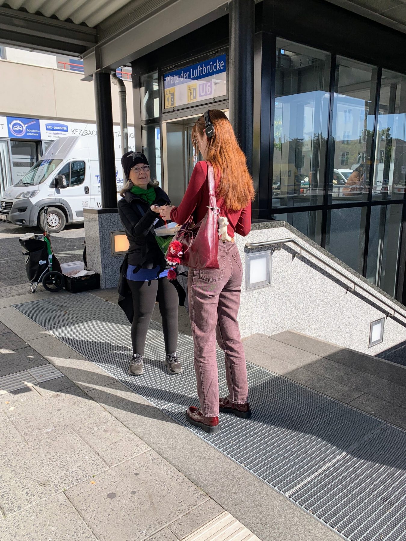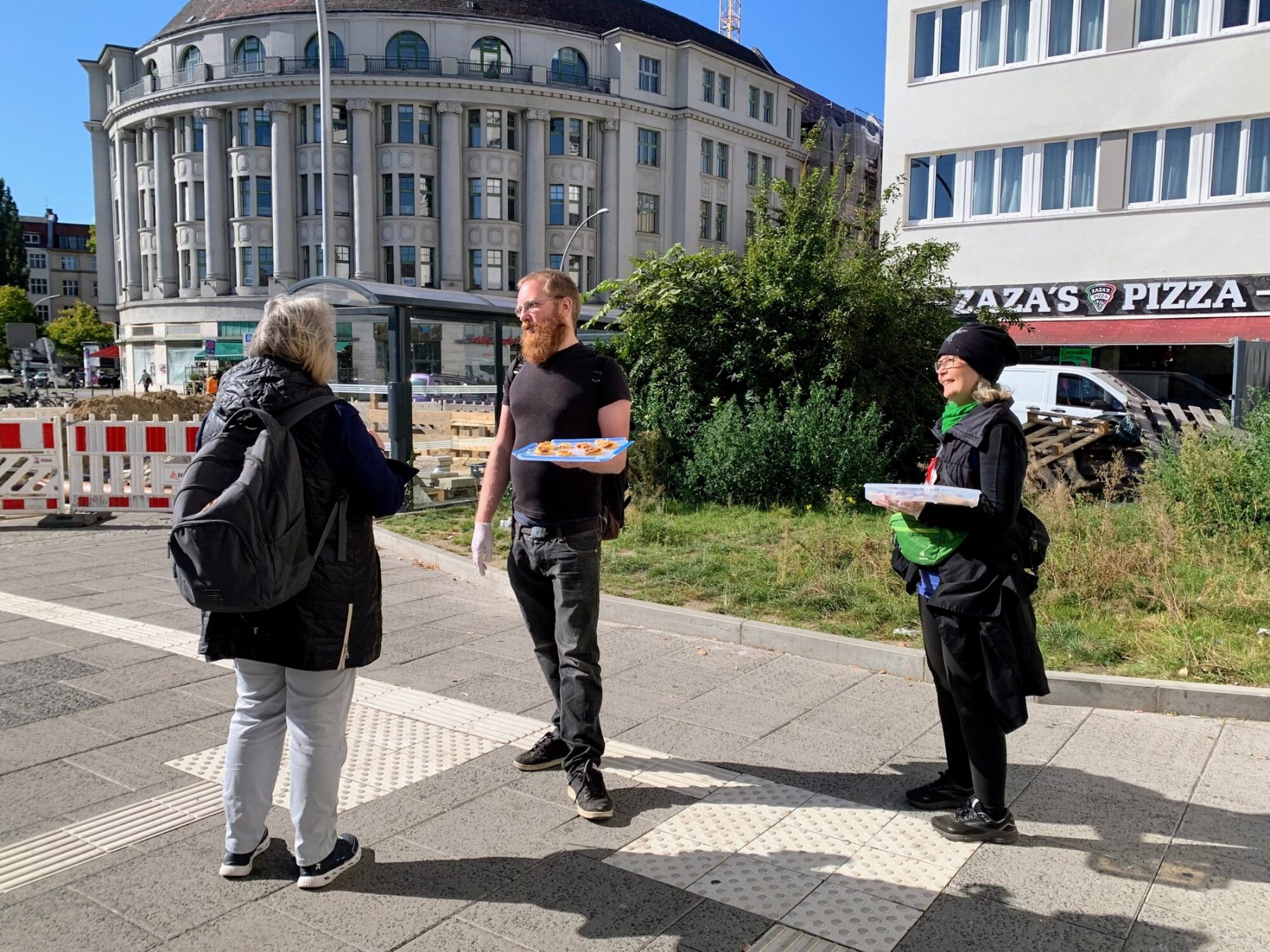 Am Platz der Luftbrücke, direkt vor dem Ein-/Ausgang des U-Bahnhofs, hatten wir unsere Happen angeboten. Viele Leute waren in Eile und winkten ab. Andere schnappten sich überrascht und dankbar einen Probierhappen im Vorbeigehen. Erfreulicherweise nahmen sich auch einige Leute Zeit für ein kurzes Gespräch. Wir sprachen über Inhaltsstoffe und Zubereitung der Happen; über die Erfahrungen der Passant:innen mit dem Thema ”vegan”; und wir erzählten, wer wir sind und wofür wir uns bei Berlin-Vegan stark machen.